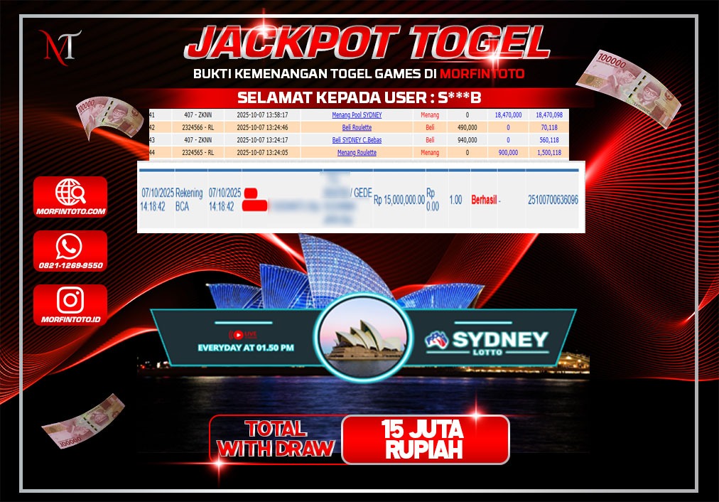 >> SELAMAT ATAS JACKPOT NYA USER ID: Sxxxb PERMAINAN TOGEL SYDNEY LOTTO PADA TANGGAL 07 OKTOBER 2025 DENGAN TOTAL KEMENANGAN Rp.15.000.000 DI BAYAR LUNAS!