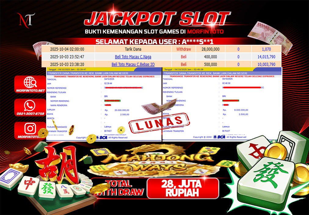 >> SELAMAT ATAS JACKPOT NYA USER ID: AxxxxSxx1 PERMAINAN SLOT MAHJONG WAYS PADA TANGGAL 04 OKTOBER 2025 DENGAN TOTAL KEMENANGAN Rp.28.000.000 DI BAYAR LUNAS!