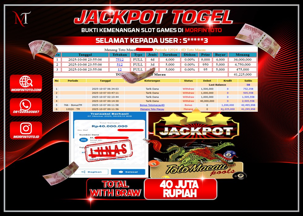 >> SELAMAT ATAS JACKPOT NYA USER ID: SxxxAxx3 PERMAINAN TOGEL TOTOMACAU 4D P6 PADA TANGGAL 06OKTOBER 2025 DENGAN TOTAL KEMENANGAN Rp.40.000.000 DI BAYAR LUNAS!